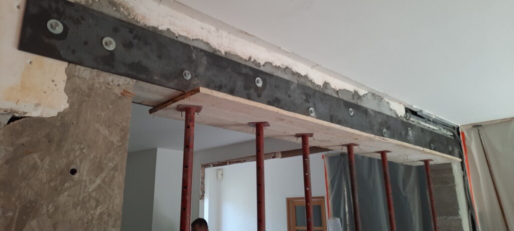 Création d’une ouverture avec renforcement du mur porteur, reconstruction et rénovation.