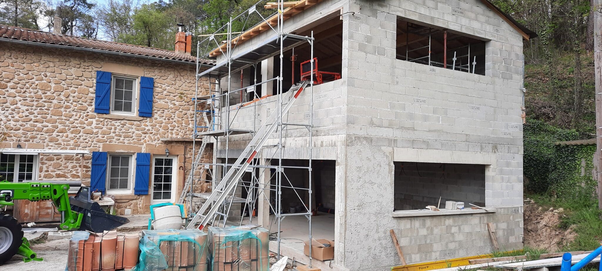 Construction d’une aile de la maison à rénover sur poteaux renforcés. L’ AGRANDISSEMENT est réalisé en étage, impliquant une intervention
