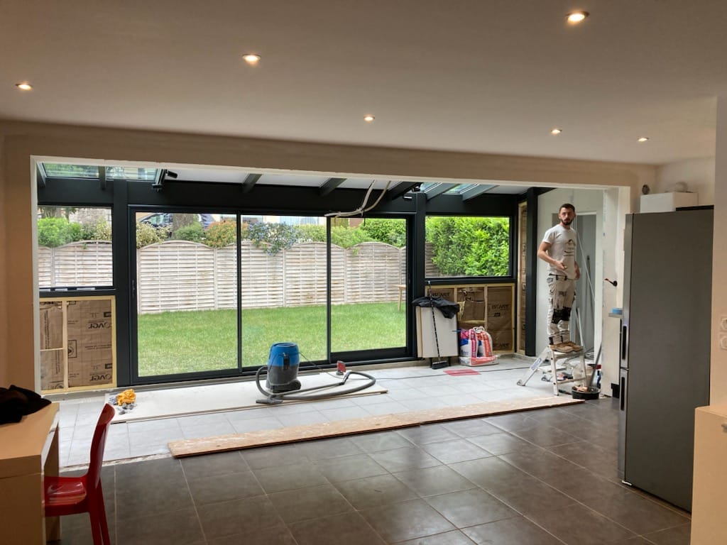 Agrandissement de la maison sur l’existant: Découpe des murs porteurs sur les façades avant et arrière. Fermeture des terrasses. Pose